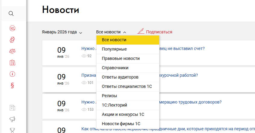 В разделе «Новости» с помощью кнопки «Подписаться» можно настроить рассылку по конкретным тематикам. Например, информация о вышедших обновлениях будет актуальна для it-специалиста, а изменения в законодательстве — руководителю и бухгалтерии.